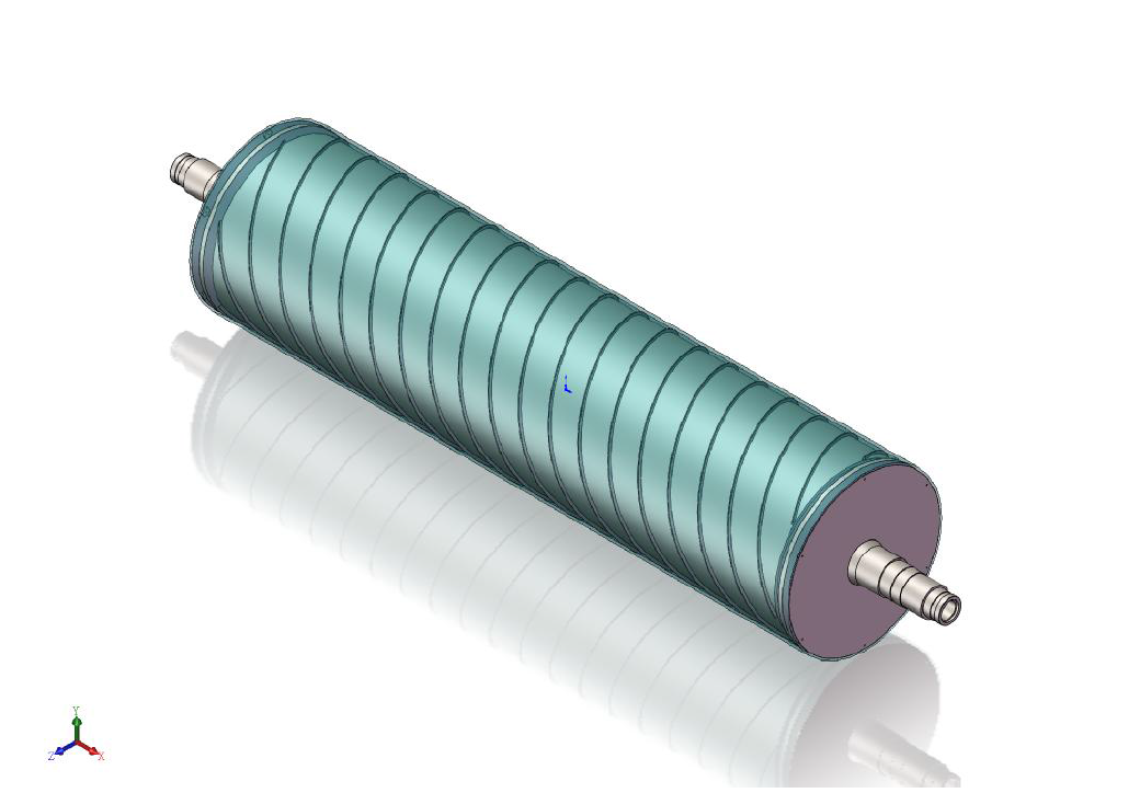 雙流道大直徑流延主冷輥,包括輥筒、進(jìn)水導(dǎo)流器、出水導(dǎo)流器,進(jìn)水軸頭管和出水軸頭管,輥筒包括外筒、與外筒同軸設(shè)置的內(nèi)筒和在外筒、內(nèi)筒之間設(shè)置的多個(gè)螺旋導(dǎo)流片,相鄰兩個(gè)螺旋導(dǎo)流片構(gòu)成一個(gè)螺旋導(dǎo)流槽,進(jìn)水導(dǎo)流器、出水導(dǎo)流器分別固定連接在輥筒的兩端,進(jìn)水軸頭管和出水軸頭管分別安裝在進(jìn)水導(dǎo)流器、出水導(dǎo)流器上。大直徑流延主冷輥,結(jié)構(gòu)簡(jiǎn)單,由于設(shè)置了進(jìn)水導(dǎo)流器和出水導(dǎo)流器,可有效降低主冷輥內(nèi)部的流動(dòng)阻力,能夠使得流入輥筒內(nèi)的冷卻水量更加均勻,提高主冷輥的送水能力,提高主冷輥冷卻效率,有效提高輥筒表面的溫度均勻性,節(jié)約能耗。